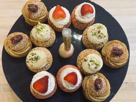 Clients who plan parties at Miette often ask for an additional dessert. We are pleased to offer a selection of delicious and elegant choux which can be prepared in advance for cooking parties or corporate team-building events. These delicious choux can be served alongside the dessert your guests are preparing.
